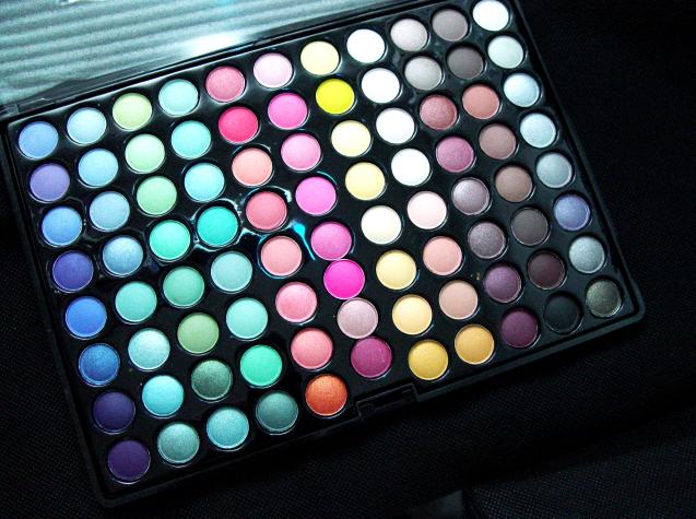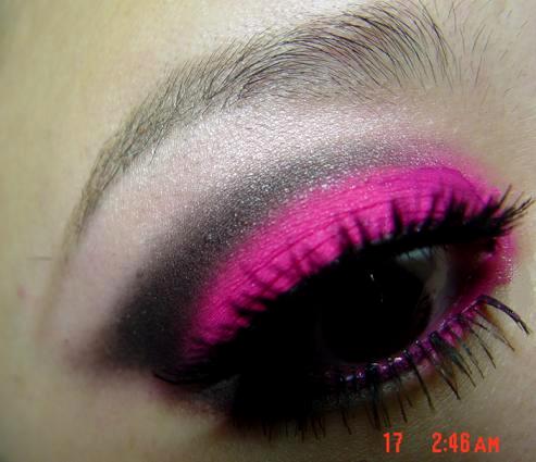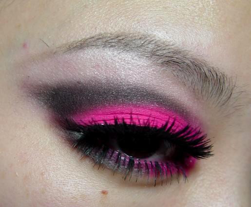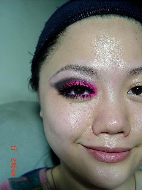 然後把眼摺裡面已經用彩繪筆打好底的部份使用最中間那排底下數上去第三個粉紅色,狠狠地瘋狂的把顏色壓上去,然後在用那唯一的黑色右二最底下那個顏色,小心的化在眼窩上並且慢慢的均勻的暈染開來,然後在用中間那一排第一顆的最淡的粉紅色上在眉骨上打亮,再戴上上下假睫毛就完成了。